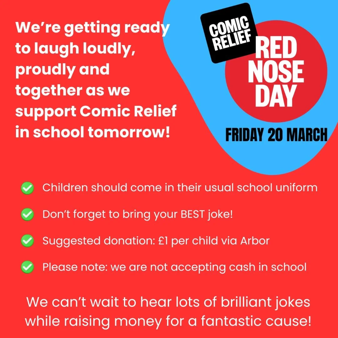 On Friday 20th March, we will be supporting Comic Relief in school. We are inviting parents and carers to make a suggested donation of £1 per child, to be paid via Arbor. Please note that we will not be accepting cash donations in school.