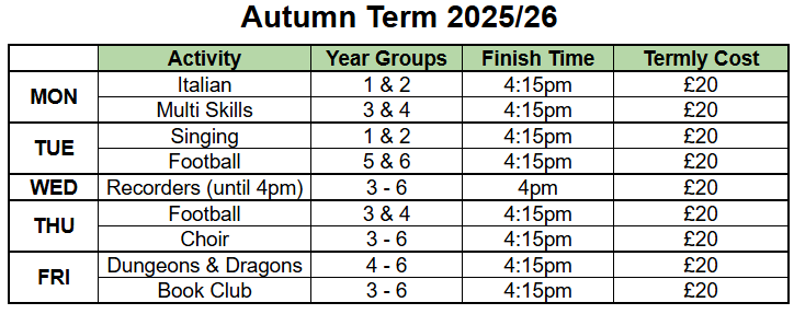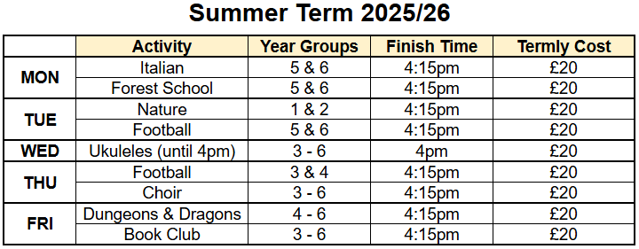 We offer a range of extracurricular activities, as detailed below. If you would like your child to attend any of the activities, please log on to the Arbor App or Parent Portal and complete the booking.