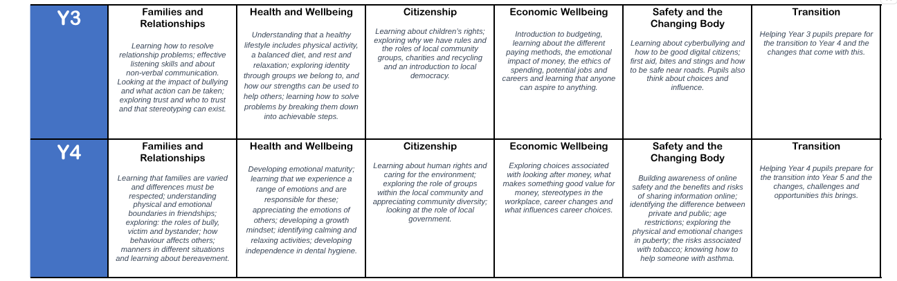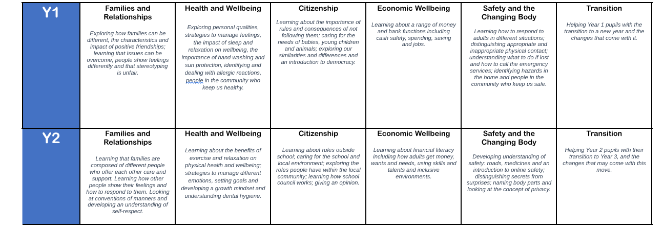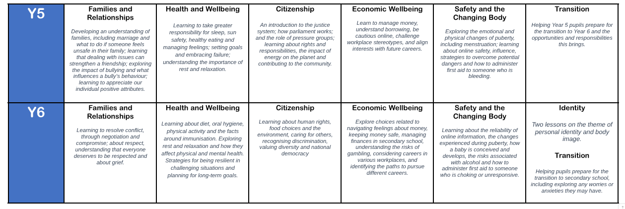 These key areas are revisited through each year group, ensuring clear progression, coherence and balance. In Year 6, pupils also explore an additional key area, Identity, to support their transition to secondary school. This progression can be seen in our long-term plan below: